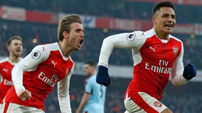 Luapan kegembiraan Alexis Sanchez (kanan) seusai membawa Arsenal menang 2-1 atas Burnley di Stadion Emirates, Minggu (22/1/2017). (Ian KINGTON / AFP)