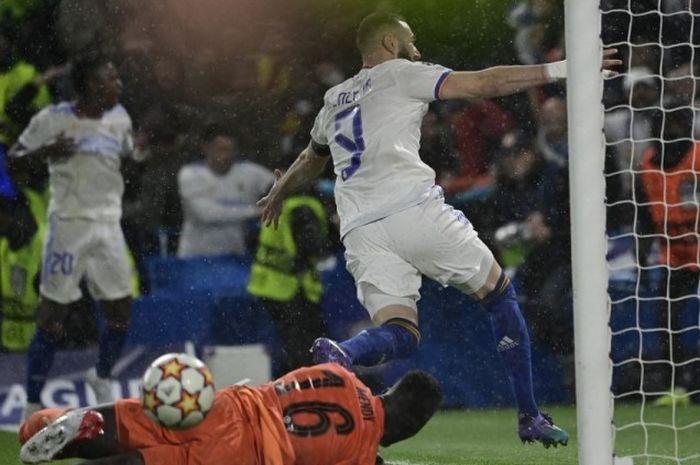 Dengan kecepatan berlari, Karim Benzema menyambar bola dan menendangnya ke gawang Chelsea yang sudah kosong ditinggal kiper Edouard Mendy.