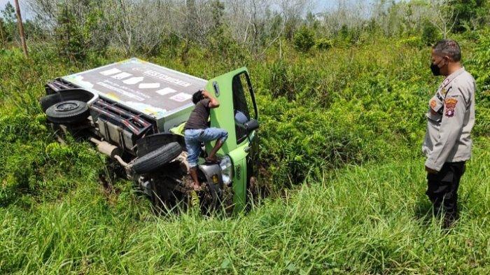 Pecah Ban, Mobil Truk Box Laka Tunggal Terbalik di Pinggir Jalan Mahir Mahar Palangkaraya