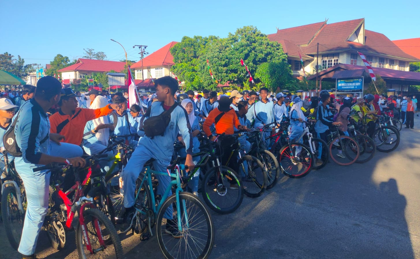 Pagi hari, Jumat (12/8/2022), ratusan pelajar di Kabupaten Kotawaringin Timur (Kotim) berkumpul di Jalan Yos Sudarso, sekitar Taman Kota Sampit untuk melakukan gowes atau bersepeda santai bersama-sama.