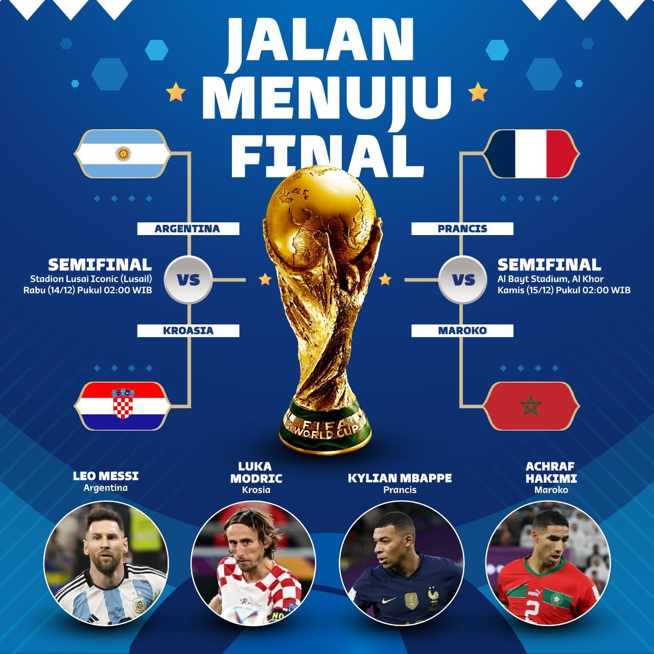 Babak semifinal Piala Dunia 2022 akan berlangsung mulai Rabu (14/12) dengan laga Argentina vs Kroasia dan dilanjutkan keesokan harinya dengan laga Prancis vs Maroko.