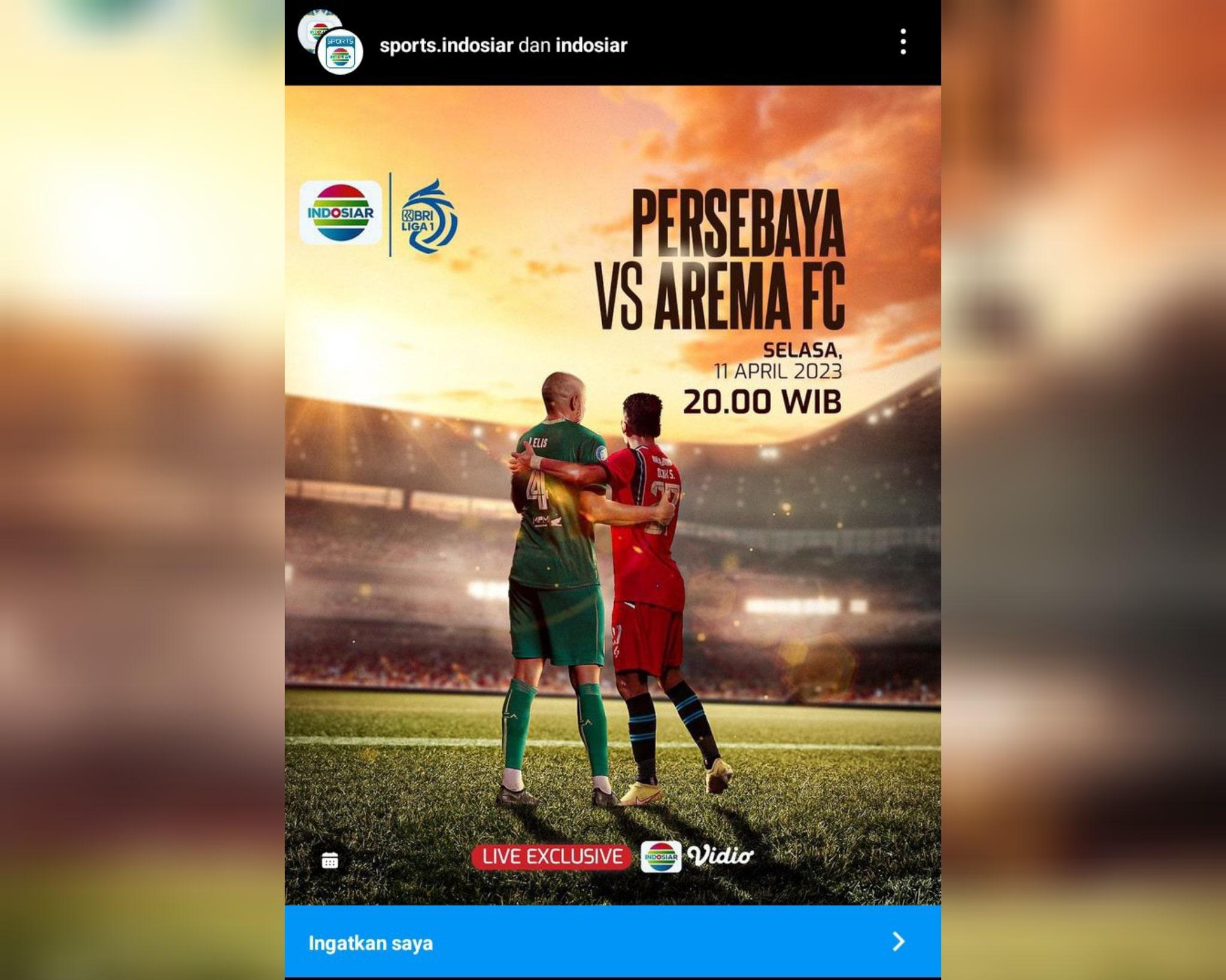 Siaran Langsung Indosiar Pertandingan Persebaya Surabaya Vs Arema FC di laga Pekan 28 Liga 1 2022/2023 malam ini , Selasa (11/4/2023).