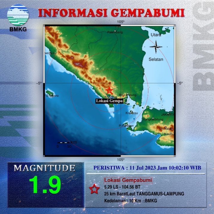 Info Gempa Mag:1.9, 11-Jul-23 10:02:10 WIB, Lok:5.29 LS - 104.56 BT (25 km BaratLaut TANGGAMUS-LAMPUNG), Kedlmn: 10 Km ::BMKG.