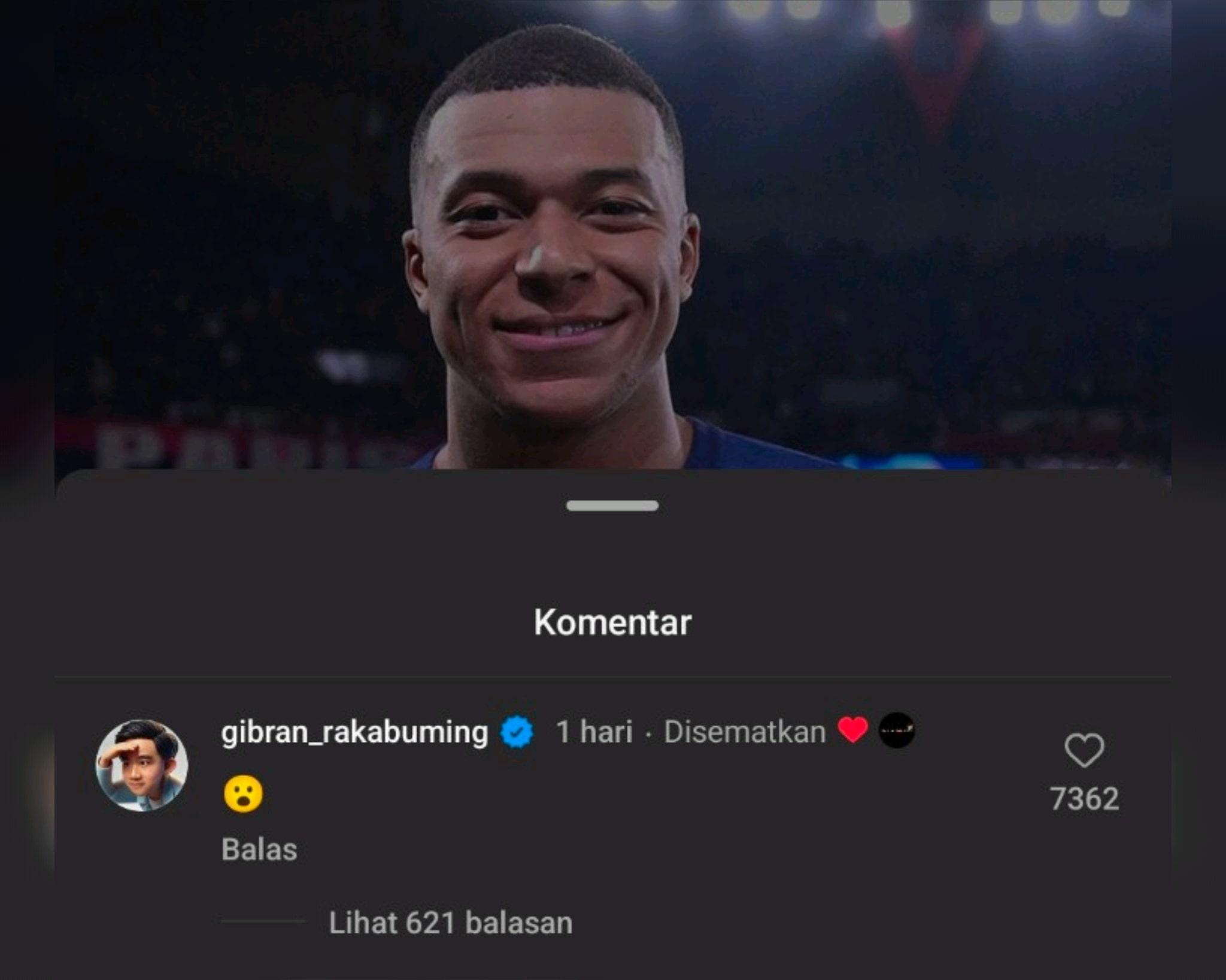Simbol rasa terkejut dari Gibran Rakabuming disukai ribuan netizen, ratusan ragam komentar membuat semarak unggahan kabar Mbappe ke Real Madrid.
