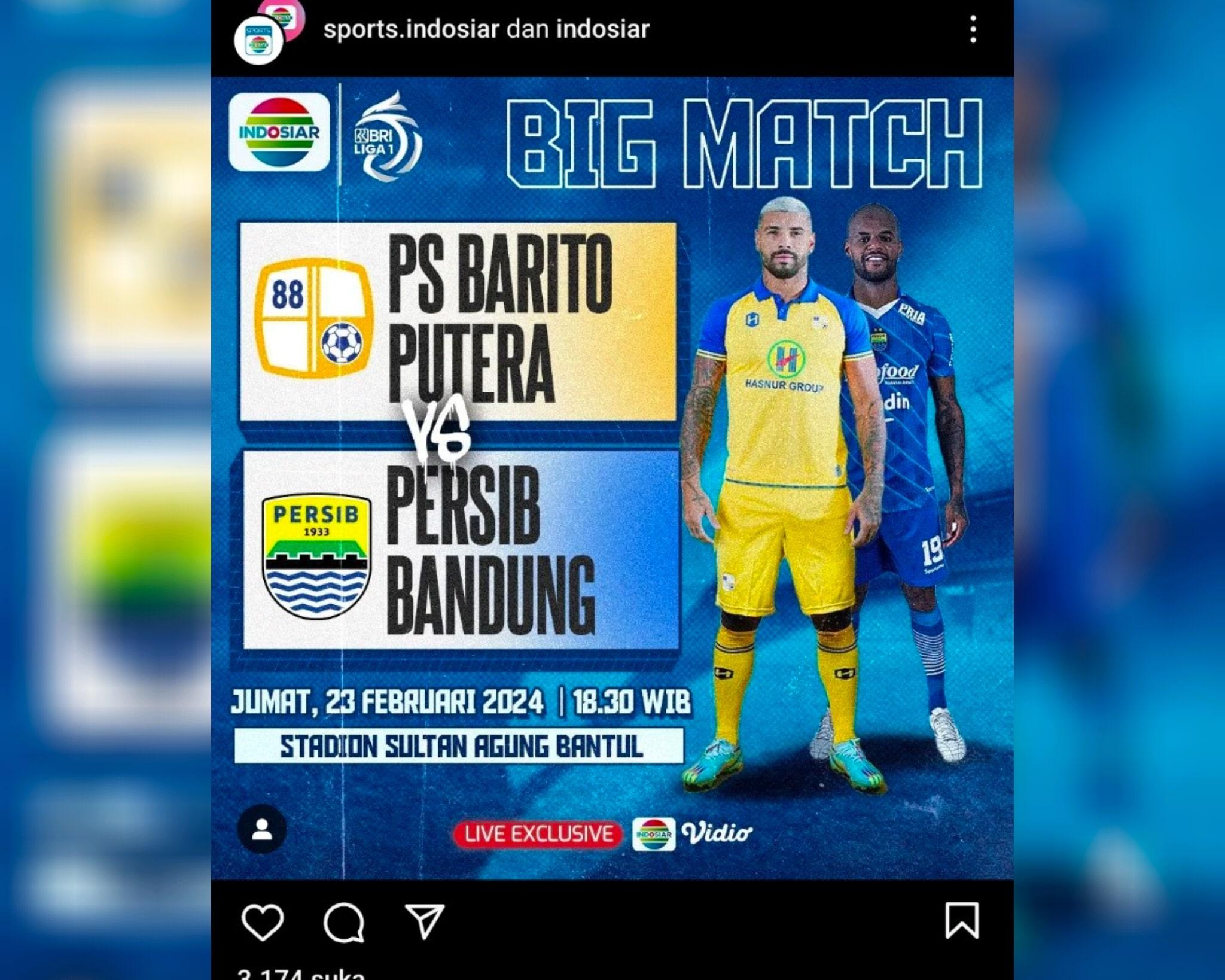 Siaran Langsung Indosiar dan Live Streaming Bola Barito Putera vs Persib Bandung di Stadion Sultan Agung Bantul. Kejar PSIS Semarang.