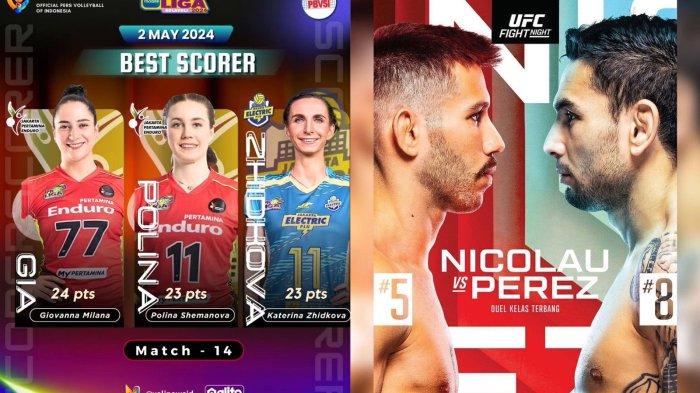 Jadwal siaran tv sport hari ini, Jumat 3 Meu 2024, PLN Mobile Proliga 2024 di Moji TV dan UFC Fight Night di Net TV.
