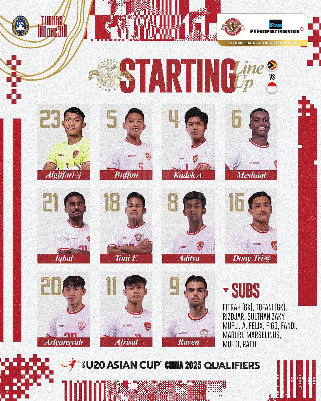 Timnas U-20 Indonesia: 23-Ikram Algiffari (PG), 4-Kadek Arel, 5-Alfharezzi Buffon, 6-Meshaal Hamzah, 8-Aditya Warman, 9-Jens Raven, 11-Riski Afrisal, 16-Dony Tri Pamungkas (Kapten), 18-Toni Firmansyah, 20-Arlyansyah Abdulmanan, 21-Iqbal Gwijangge