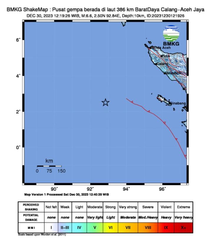 BMKG merilis gempa terkini yang mengguncang Calang Aceh Jaya, Sabtu 30 Desember 2023 siang ini dengan magnitudo 6,6 skala richter.