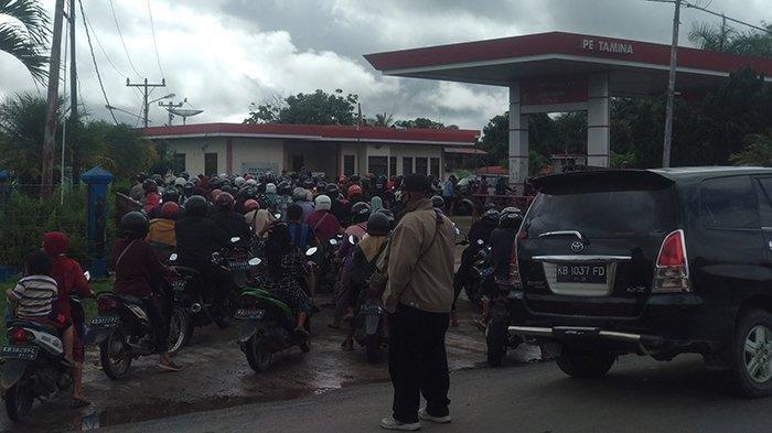 Warga mengantre di SPBU di Kedamin Darat, Kecamatan Putussibau Selatan, Kamis (11/11/2021) pukul 09.05 WIB akibat hoaks stok BBM habis